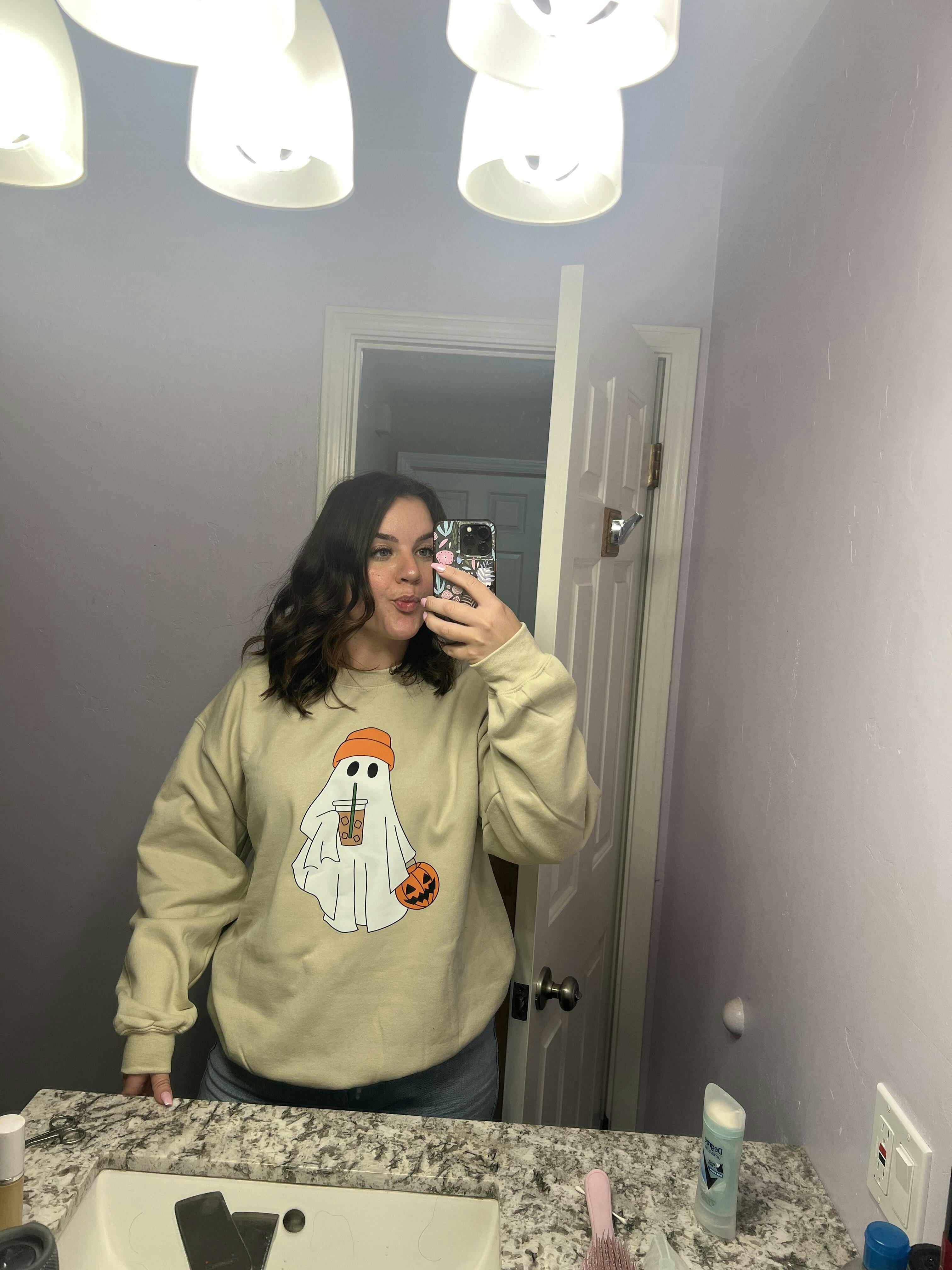Make a statement in this stylish sweatshirt featuring a cute ghost sipping on a Starbucks drink and donning a cozy beanie. Stand out from the crowd with this unique look!